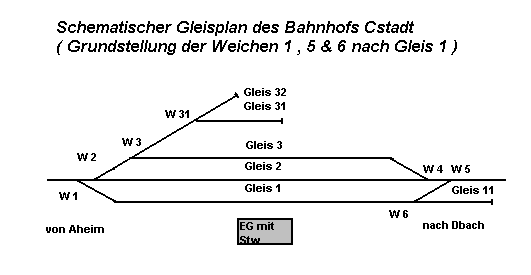 Der Gleisplan von C-Stadt mit Angabe über die Grundstellung der Weichen, welche bei Verlassen des Bf wieder herzustellen ist |