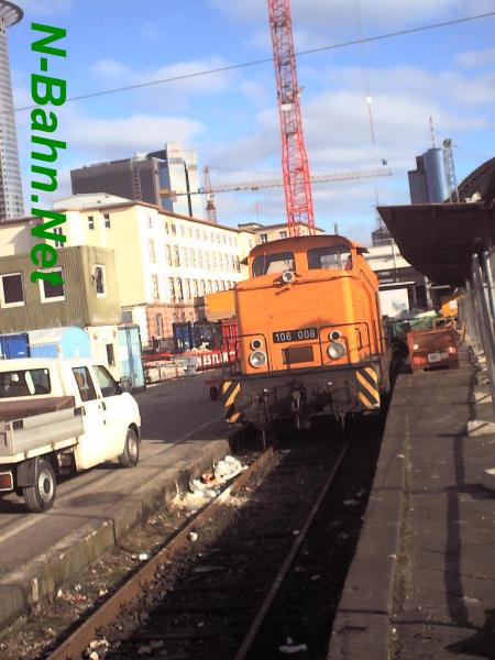Am 24.01.03 konnte man ITL Lok 106 008 bei der Anlieferung von Baumaterial am Frankfurter Hbf beobachten. Zum Einsatz kamen die firmeneigenen Res Wagen. So werden LKW - Ladungen gespart!