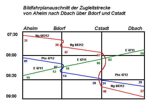 Am einfachsten lassen sich diese komplexen Abläufe jedoch an einem Beispiel erläutern: In unserem Fall dienen hier die Züge P 4711 , Pto 4712 und Ng 68312 auf der Zugleitstrecke von Aheim nach Dbach über Bdorf und Cstadt als Protagonisten.